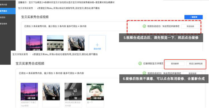 第四步:合成后可预览效果、一键装修。记得先预览再装修;装修后效果不满意可以取消装修,重新挑选内容重新合成。