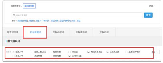 然后你再点击一下“相关搜索词”这个模块,下面有很多的数据指标,这是你选择长尾词非常重要的点。比如搜索人气、点击率、商城点击占比、在线商品数、支付转化率等等。然后你会发现,生意参谋会根据“高跟鞋女夏”这个关键词给你推荐500个长尾词,都是围绕这个核心词的。那么这才是跟你高度相关,并且对店铺标签的强化和产品标签的强化,有积极的促进作用的。