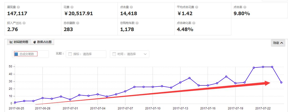 做好这三项后,大家可以看到直通车的点击率平均都是在9%以上,这样的车开起来,才能走得更顺,走得更快,店铺的成长离不开车子的辅助.只有把直通车的数据做好做稳了,单品的权重才会起来,店铺才会成长,大家可以看直通车的报表及成交笔数 也是一直呈增长曲线,现在直通车的点击率与转化率都是相当稳定,随着预算的增加,直通车成交的笔数也是直线增长,在这样的,高点击率,高转化率的数据支撑下,推广的单品的排位也是日 日 上涨,获取访客的能力也是渐渐增强,因此我才跟大家分享说,这家店铺的成长绝对离不开直通车的推广.