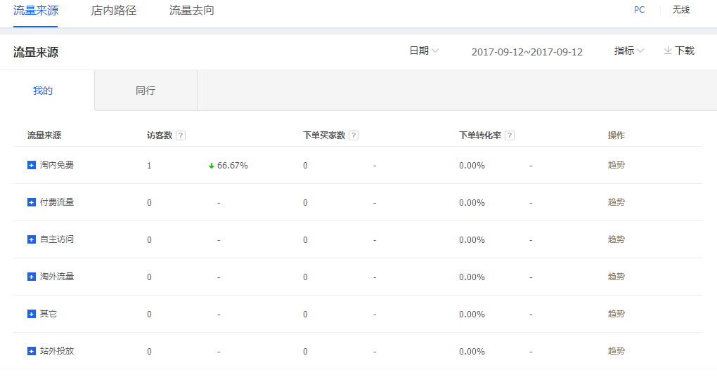 对于这里,我们不仅仅要去看前面的综合支付转化率,我们还需要去看各个的主流渠道的下单转化率。如果说你的主流量来源转化出现了问题,那么很有可能会导致这个流量渠道受到影响,特别是对于自然搜索和直通车流量。