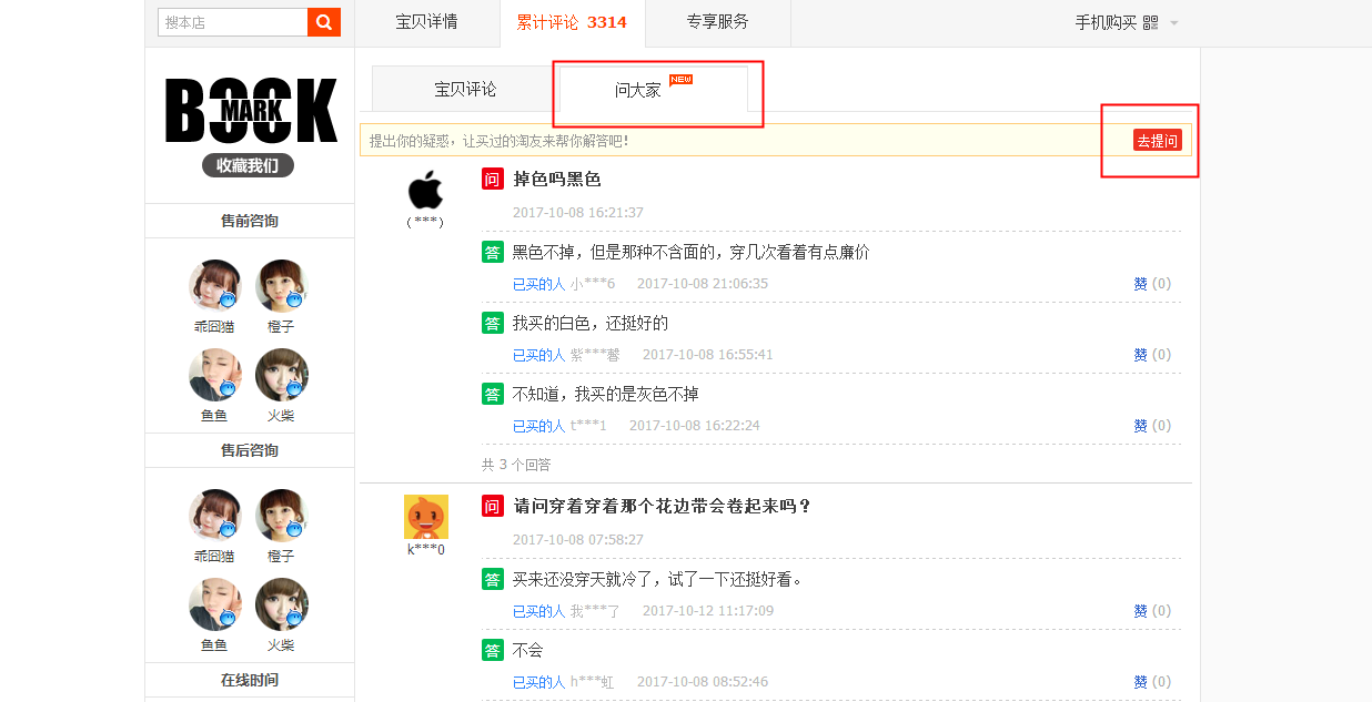 在这里问大家的问题一般都是真实的买家想要去了解的关于宝贝的真实的情况,比较的正式,当然我们也可以自己去问一些比较搞笑的、能带来轻松氛围的问题,让已经购买的买家去回答。比如,黑色和白色会交织缠绕在一起吗?像这种话题可以让问大家的氛围变得融洽,增加其他买家对你的宝贝的印象。要注意的是问大家在我们宝贝有销量的前期做比较好,后面问的内容会参差不齐。